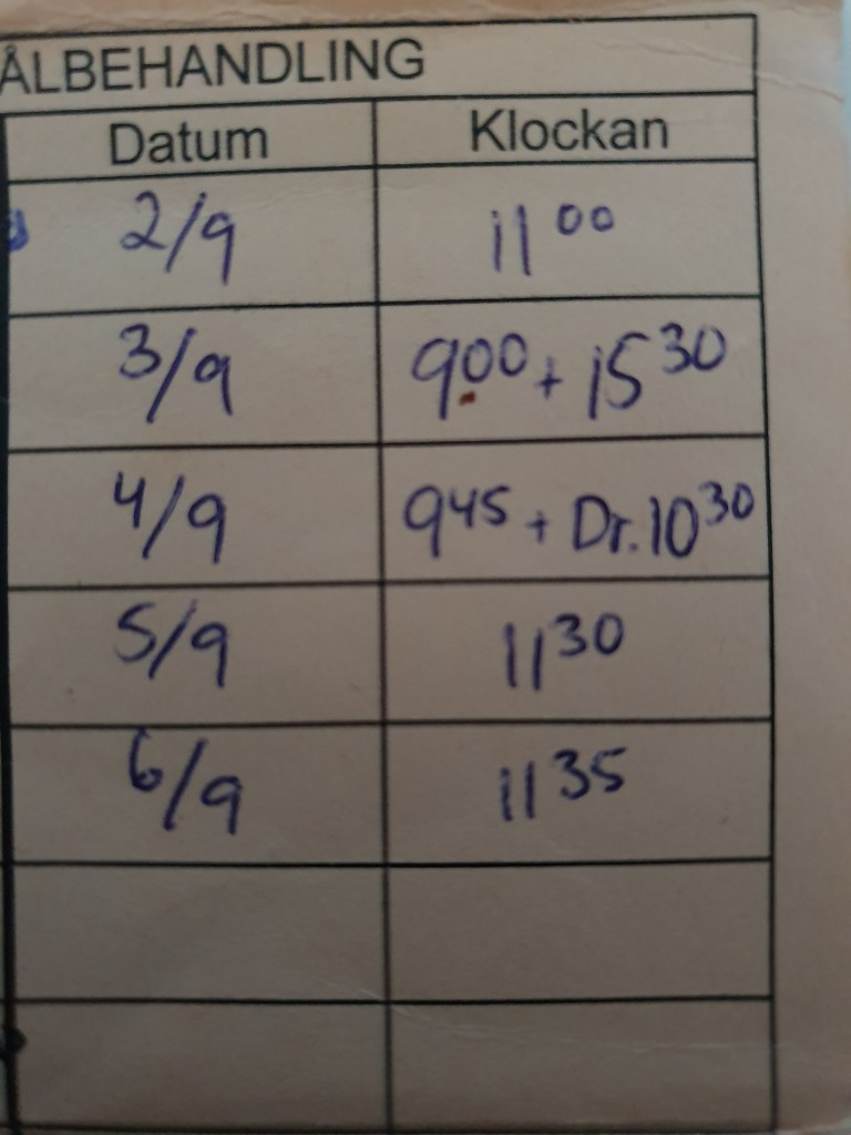 Landade senare än vanligt inför behandlingen idag. 30 minuter innan mötet med logopeden Hanna kl 11:45. Tur var väl det, kl 11:30 ropar de in mig för strålningen. Utsatt tid var idag för det 12:25. 🙂 På min väg ut fick jag mina tider för nästa vecka. Räknade till 530 idag. Tackade för mig, och åter i morgon lördag.