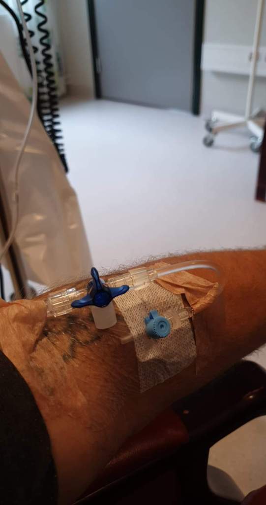 Idag var man i god tid, men det hjälpte inte idag. 10:00 var jag igång med det 4:e droppet. Bara två kvar sen. 🙂 Idag fanns det ingen ledig säng, men det funkar lika bra ändå. Fåtöljen går att ställa in så som man vill ha den.