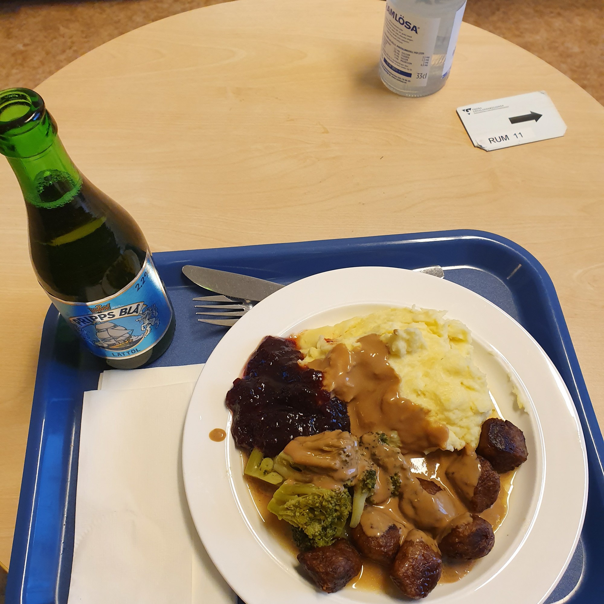 Middagen!! Också den klämmer jag ner utan problem. Denna gång fick jag ”specialkost” då jag och min mage inte klara svamp. Annars lät pasta med skinksås gott. Det lustiga är att jag bara hade nämnt detta med svamp till hon som jobbar här lite emellan raderna när vi pratade mat. Inget som jag bad om eller skrev ner någonstans. Ändå var det bokat en specialare till rum 11, perfekt. 🙂 Men jag blev inte ledsen för det, köttbullar m mos, broccoli och lingonsylt blev det för mig. Helt klart något som passade mig, trots att det nu inte smakade annat än …… nada. 🙂