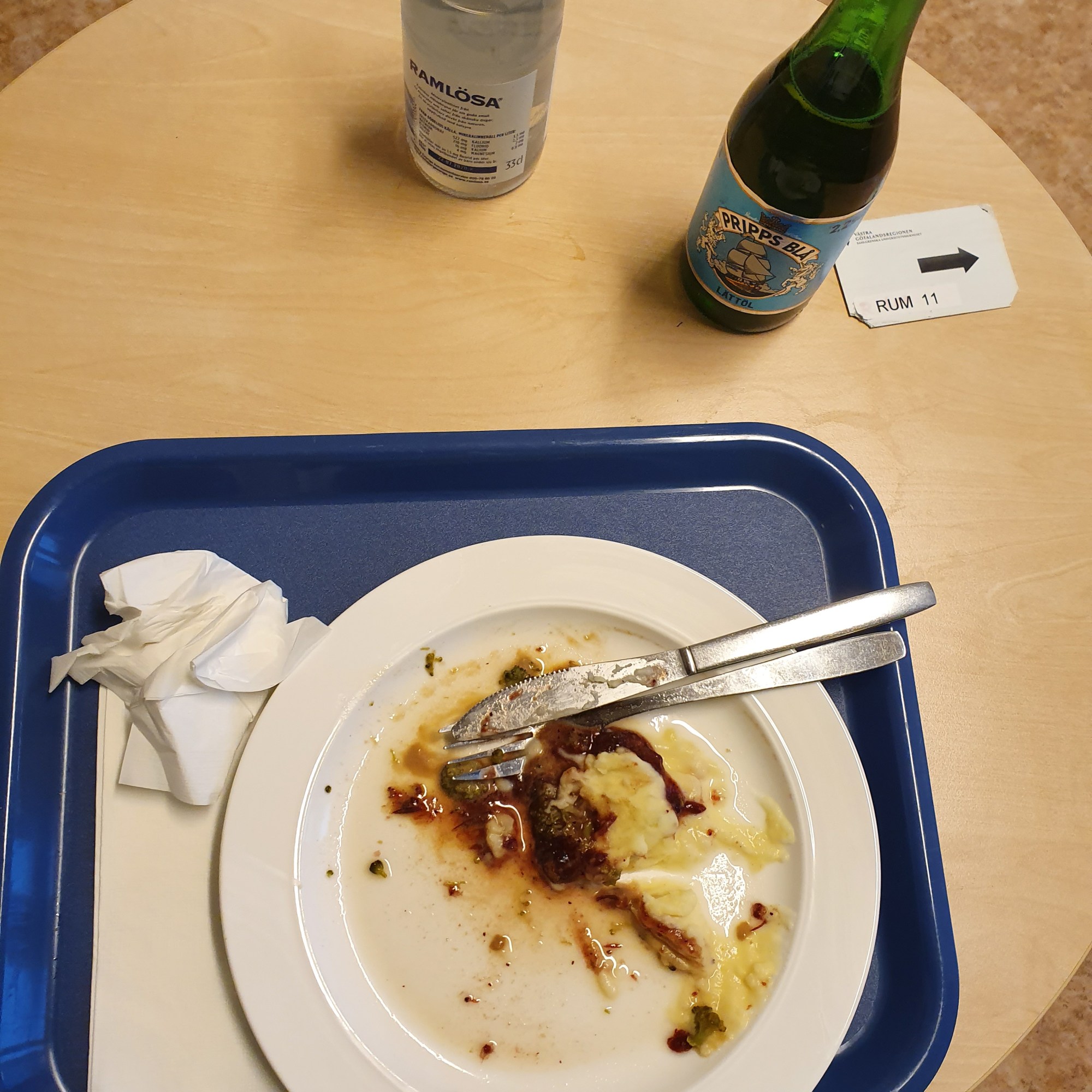 Tar mig sen med matbrickan till mitt rum för att där stoppa i mig detta moster till fisk. Då upptäcker jag att det faktiskt smakar, och det smakar gott. Och inte bara det, jag äter upp allt på tallriken också. 🙂 Nöjd och belåten avslutar jag denna måltid, (inkl all medicin och en protein) och kastar mig till horisontellt läge och vilar till nästa måltid.