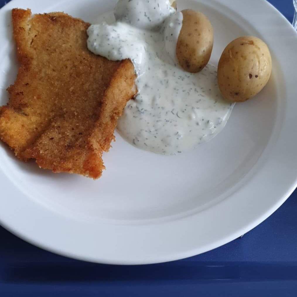 Klockan 12 serverades det lunch. Inte vilken lunch som helst, panerad fisk med remouladsås,potatis och ärtor. Ni som känner mig vet att detta med fisk……Funkar inte hos mig, och har aldrig gjort det. Men jag har blivit lite tuffare nu…. 😉